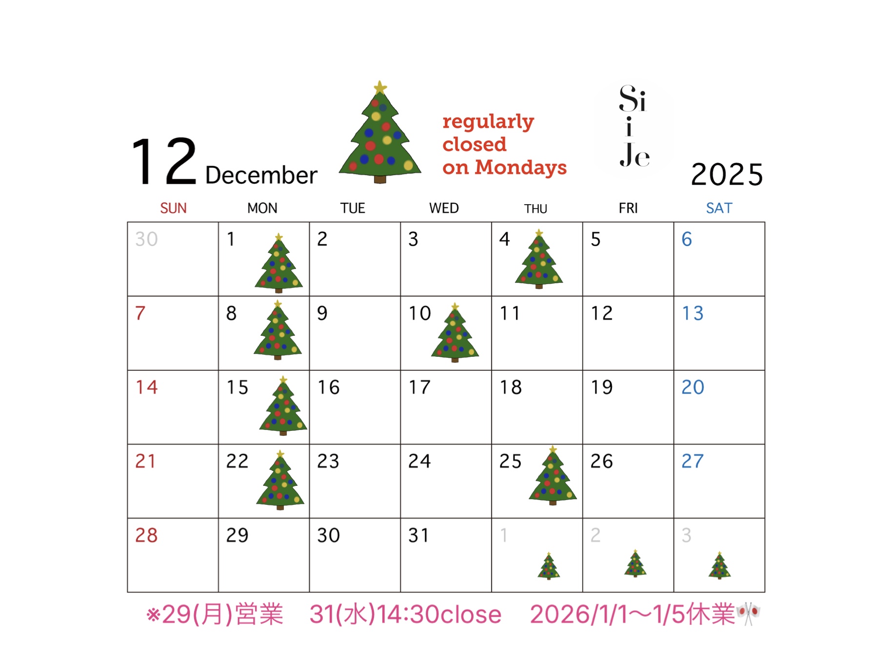 SiiJe~シイジ~1月(12月)休業日のお知らせ